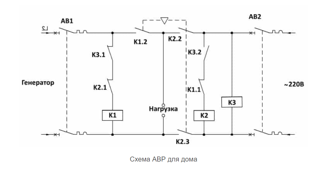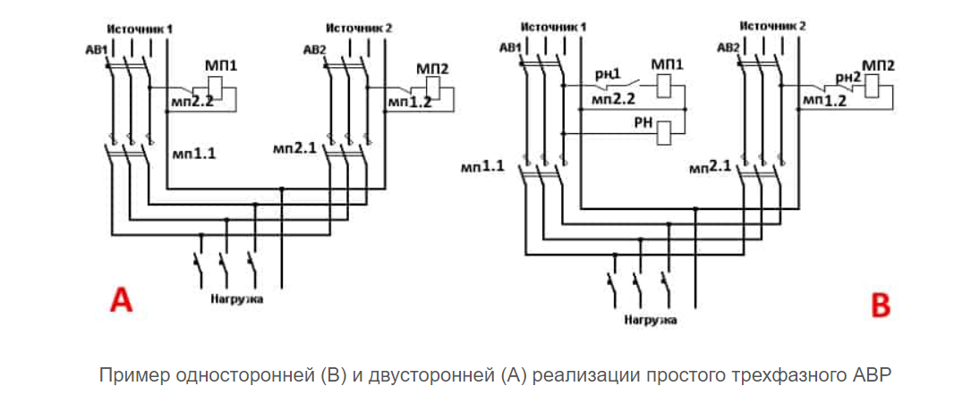 Существуют разные схемы АВР, где виден процесс перемещения электричества от основного источника на генератор. Работает принцип защиты, предотвращающие возникновение коротких замыканий – механическая блокировка и электрическая, предотвращают опускание обоих вводов одновременно.